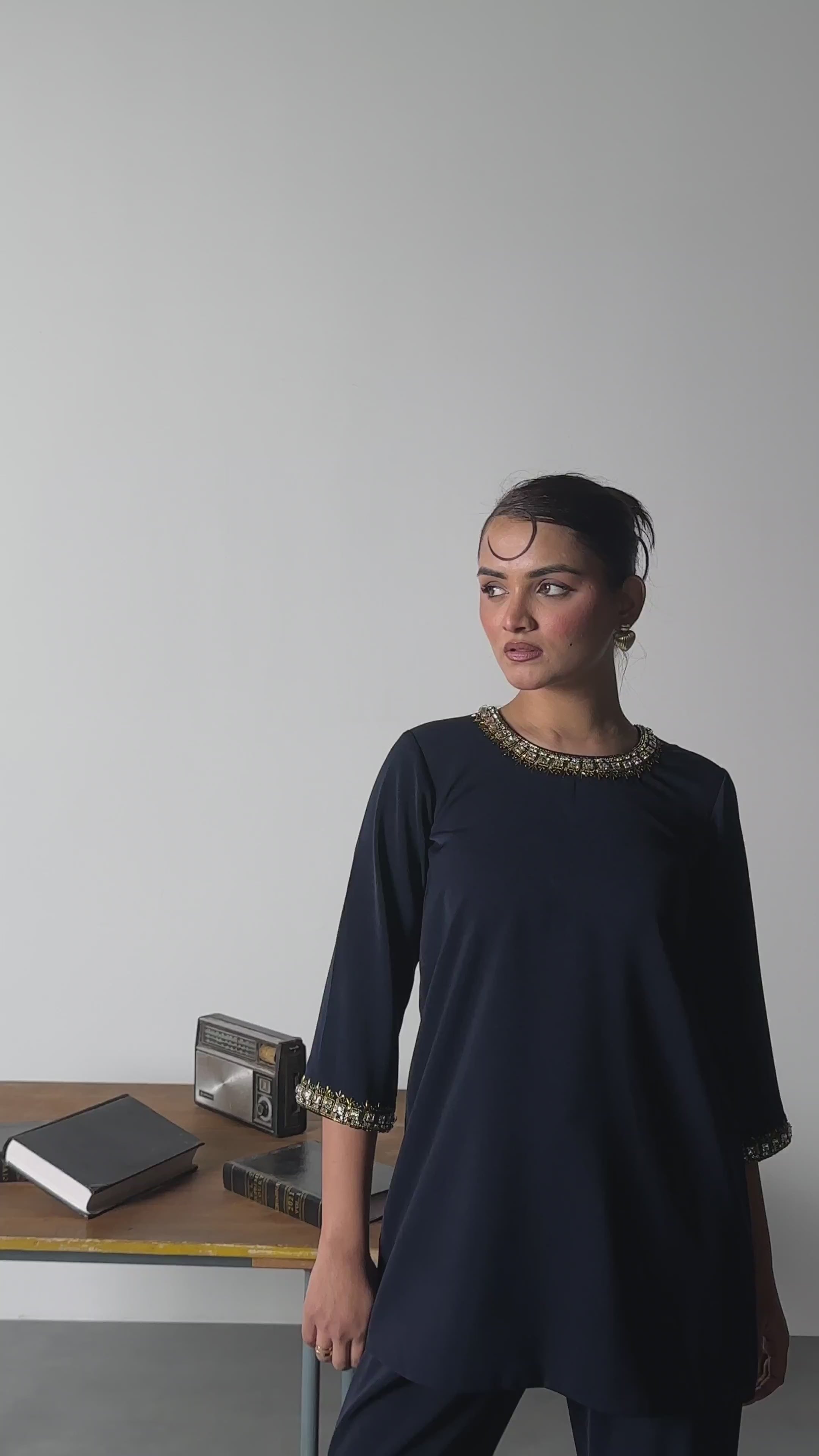 Long top with 3/4th sleeve, featuring heavy hand embellishments on the neckline and sleeve hem. Paired with flared pants featuring front slits hand embellished with beadwork along the borders, adding a touch of elegance.