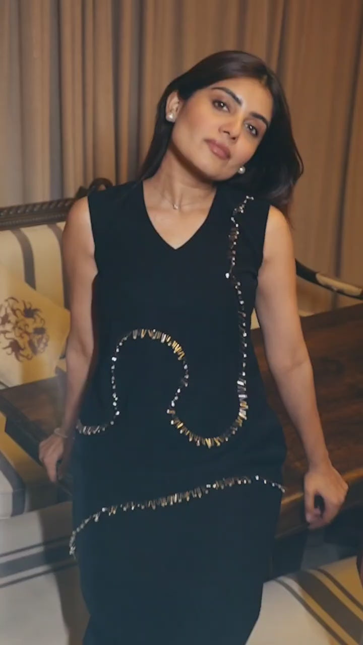 A fitted sleeveless dress featuring a hand beaded wave embellishment in the front with a front slit at the hem.