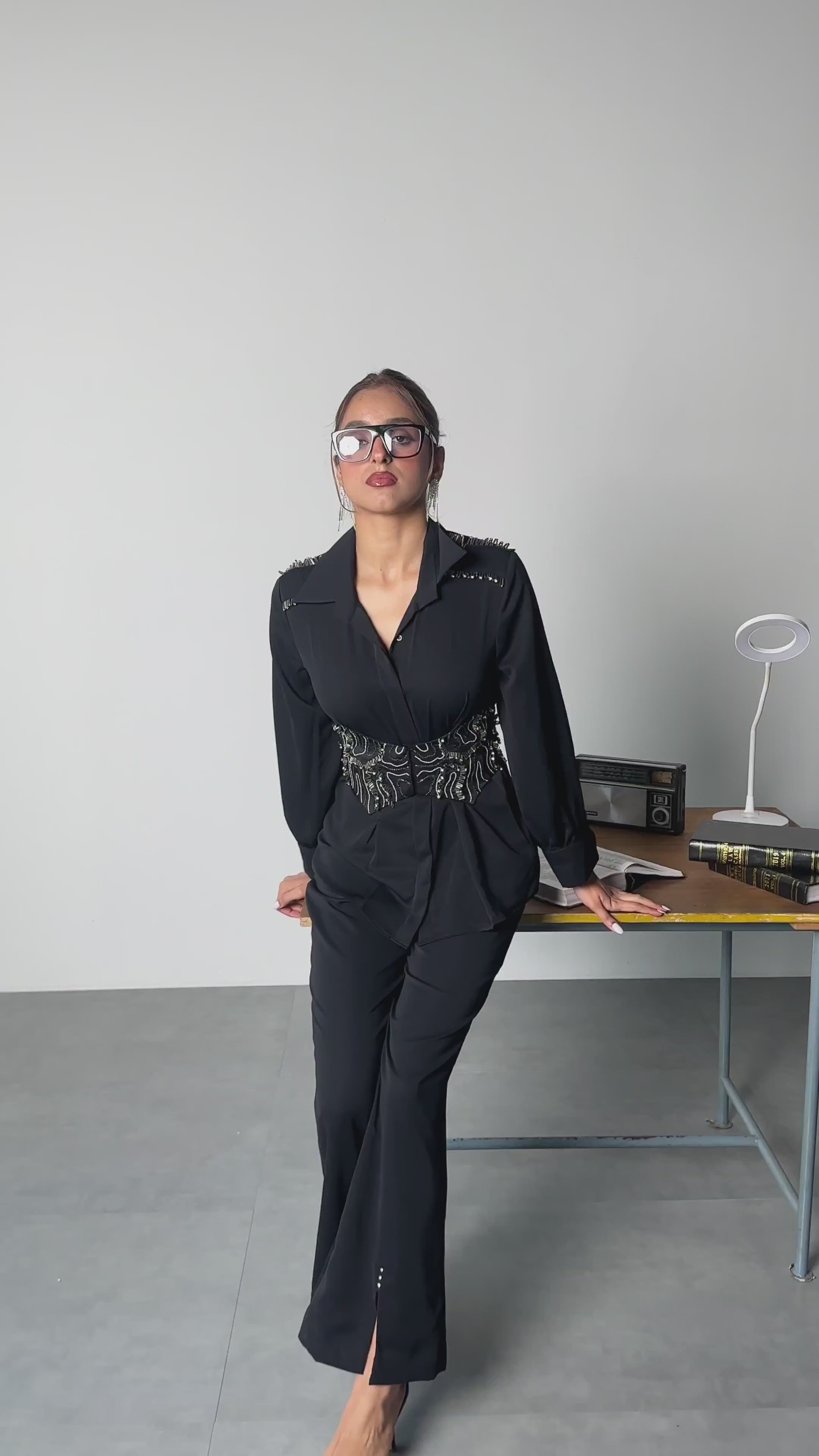 A tailored long-sleeve shirt with hand embellished shoulders and a finely detailed statement belt—sophisticated and chic styled with Lian studded pants.