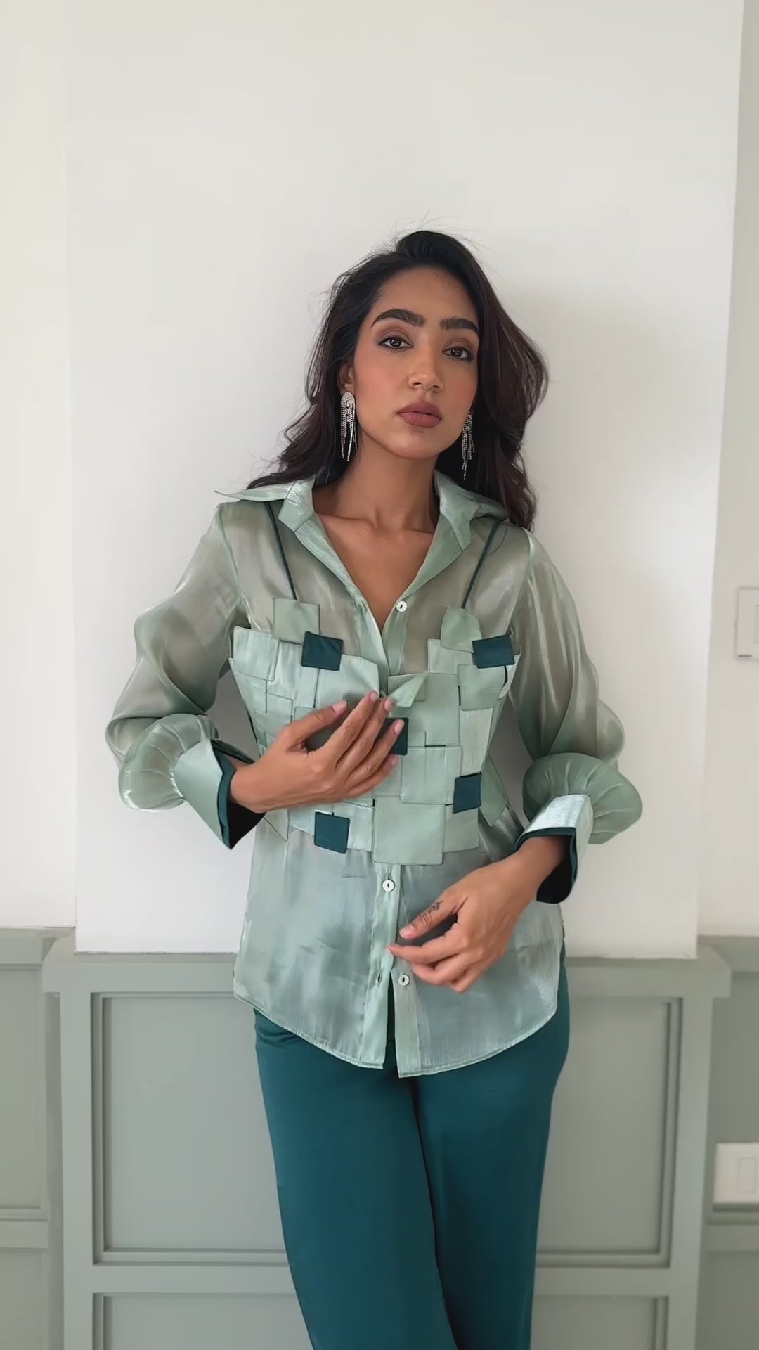 Our 2 piece set features an intricately crafted bodice adorned with squares, paired with a button-down organza shirt boasting a double cuff - one in contrast and one in a classic style.